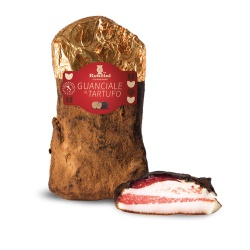 Итальянский деликатес: нежнейшая вяленая свиная щека — гуанчале с добавлением черного трюфеля. Богатый вкус и аромат подчеркивают изысканность продукта, который удобно хранить в вакуумной упаковке, сохраняя всю вкусовую насыщенность.