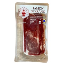 Хамон Серрано, известный во всем мире деликатес, изготавливается из свинины по традиционному испанскому рецепту и выдерживается не менее 7 месяцев. Нарезанный слайсами хамон имеет специальную пленку между кусочками мяса, которая предотвращает их слипание и делает употребление удобным. Этот деликатес обладает насыщенным ароматом, приятным натуральным вкусом и нежной текстурой, с хорошим балансом всех ингредиентов, что удовлетворит даже самого требовательного гурмана.