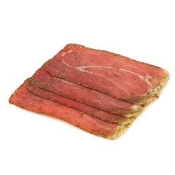 Насладитесь тонкими ломтиками нежной сыровяленой ветчины, выдержанной в соли и ароматной смеси специй: розовый и чёрный перец, тимьян, чеснок, пропитаны утончённым вкусом бальзамического уксуса.