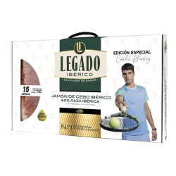 Подарочный набор изысканного хамона «де Себо Иберико» от Legado — лимитированная серия Carlos Alcaraz Special Edition. В наборе 15 аккуратных вакуумных нарезок по 50 г каждая (всего 750 г), полностью готовых к употреблению. Идеальный вариант для подарка или праздничной подачи — удобно разделять, подавать и наслаждаться каждым ломтиком.